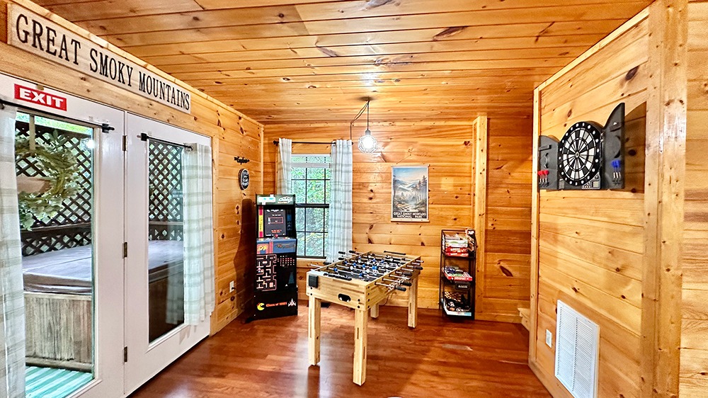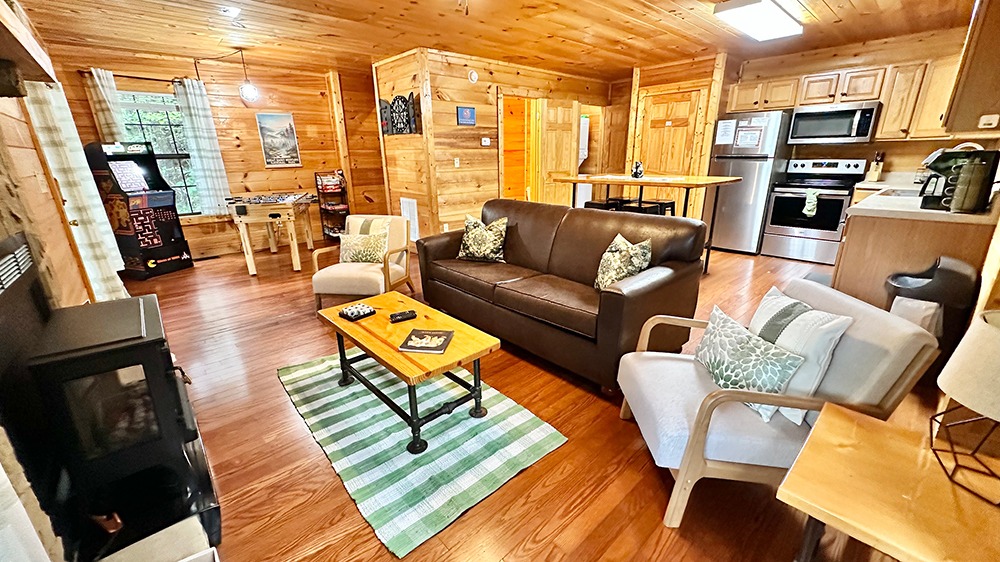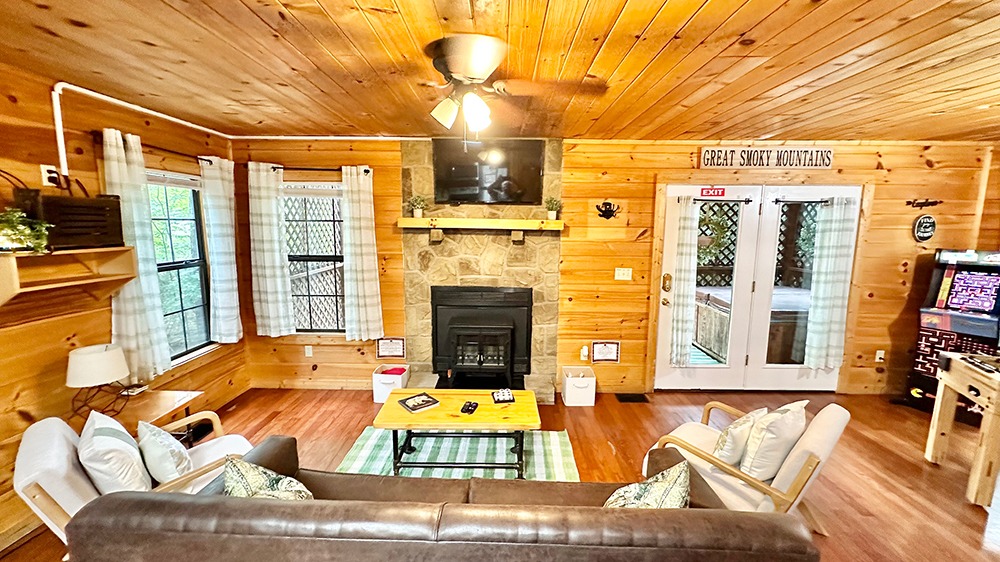 Blissful Tranquility is a pet-friendly cabin rental near Dollywood in Pigeon Forge, TN. This Smoky Mountain retreat features a private hot tub, arcade games, and streamside decks. Ideal for families, couples, and travelers with pets looking for a comfortable, entertainment-filled stay just minutes from Dollywood and the Great Smoky Mountains National Park.