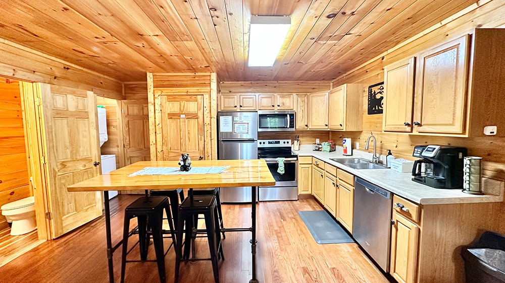 Each of our cabins will start you off with toilet paper, paper towels, dish soap, dish tabs, hand soap, laundry pods, trash bags, and a bar of soap. These items are not replenished during your stay so you may need to purchase additional supplies. We also provide all towels, washcloths, hand towels, and linens for your stay.
